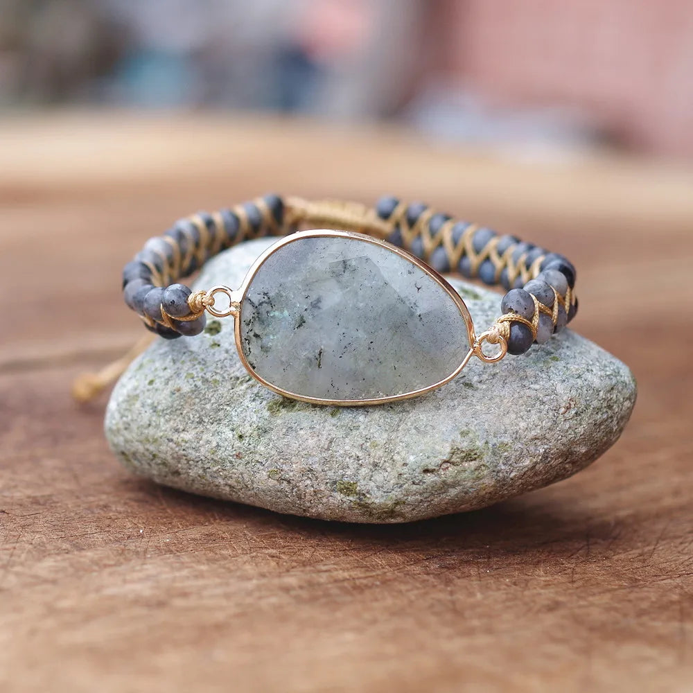 Ta ręcznie pleciona bransoletka w stylu boho i ethnic to połączenie surowej elegancji z rzemieślniczą precyzją. Centralny element w kształcie kropli nadaje jej delikatnego, a zarazem wyrazistego charakteru. Dzięki zastosowaniu regulowanego węzła przesuwnego, biżuteria ma charakter unisex i idealnie dopasowuje się do każdego nadgarstka, stanowiąc doskonały dodatek do codziennych stylizacji oraz sesji jogi.